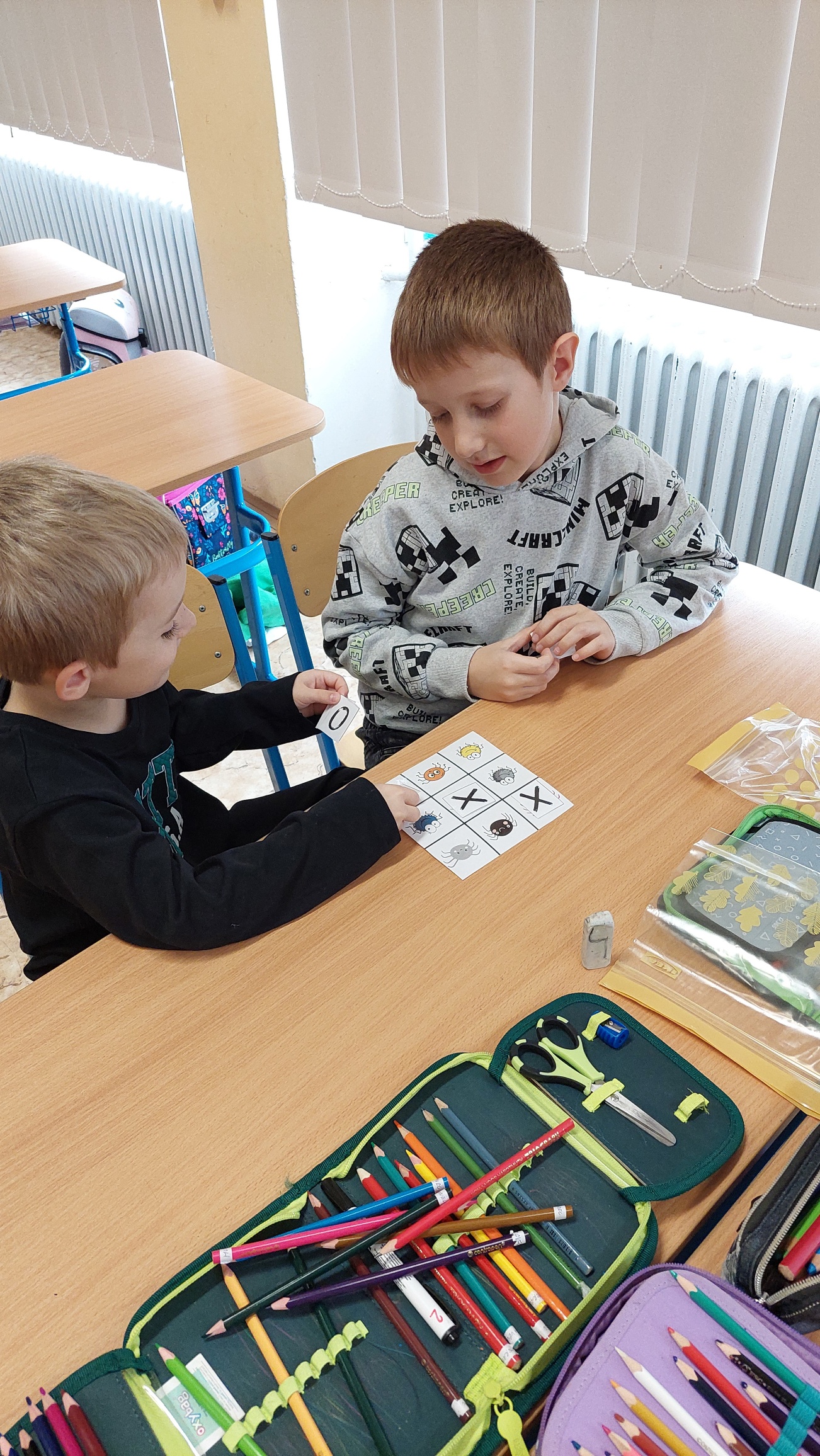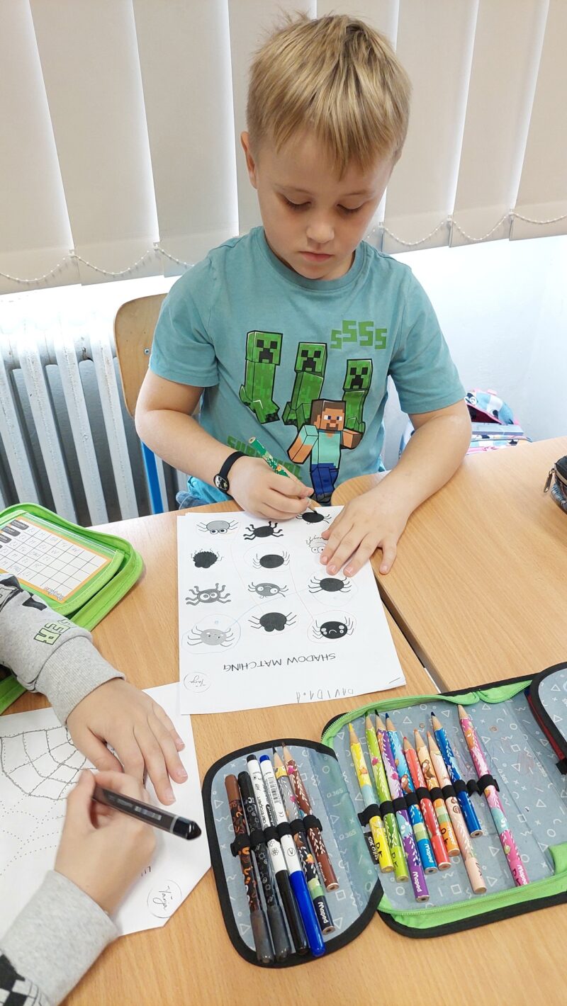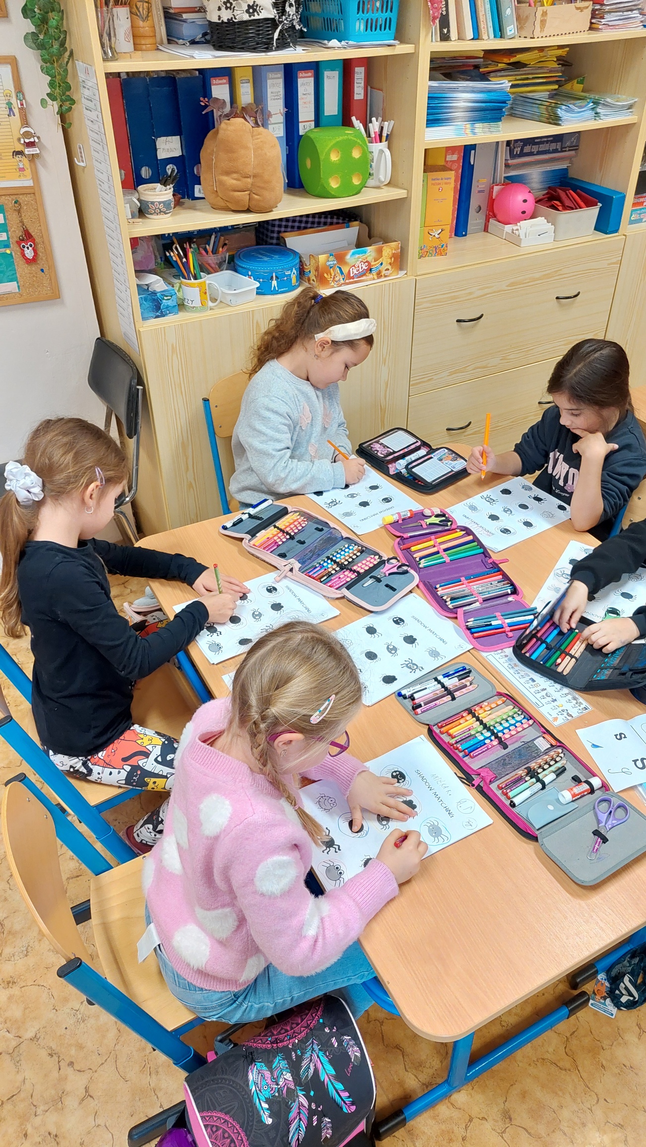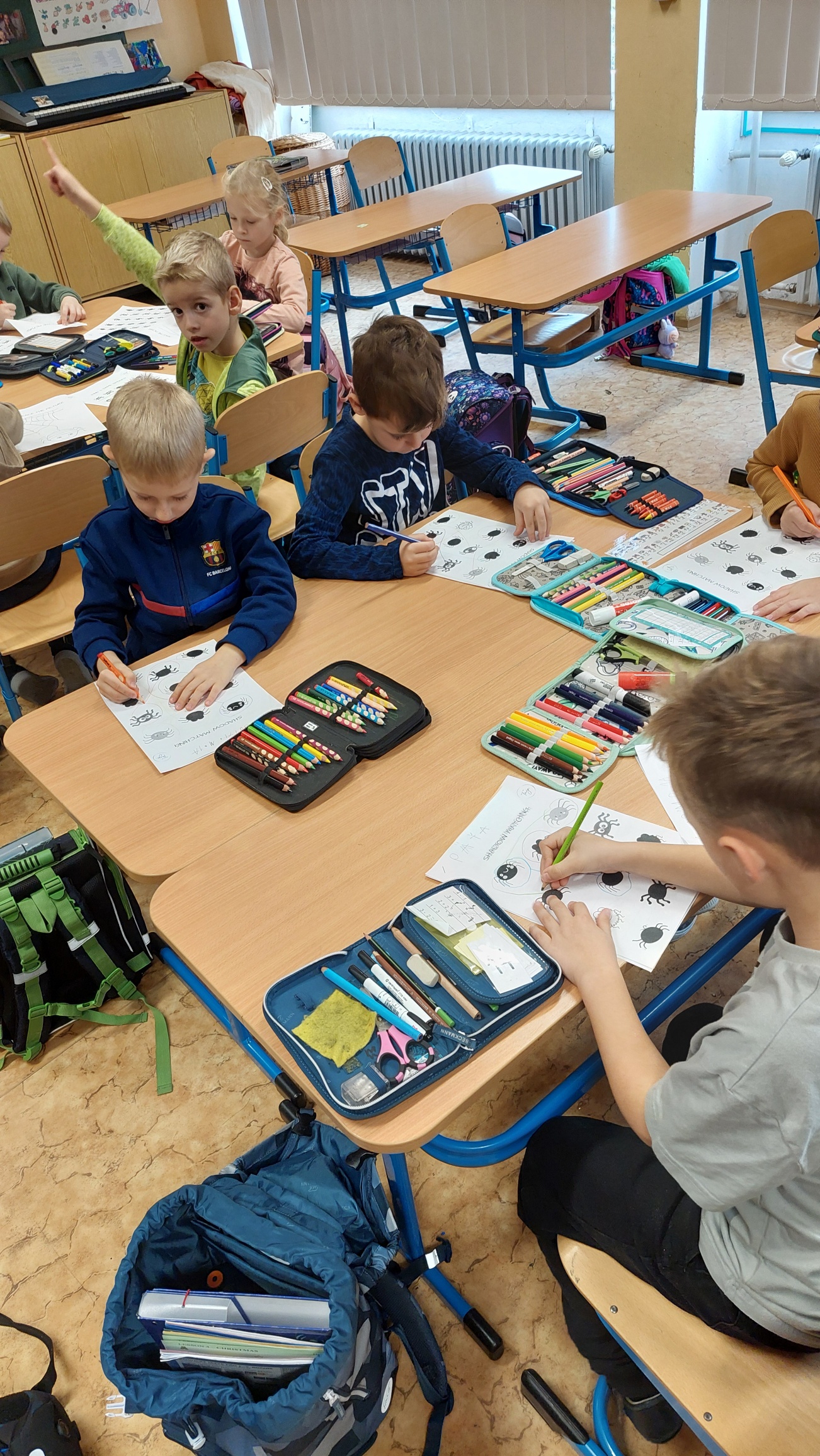 Naši nejmladší záčci z prvního stupně si vyzkoušeli první anglickou projektovou spolupráci. Tématem byl „Halloween”. Děti pracovaly v menších skupinkách. Úkolem bylo splnit úkoly na pracovních listech a po vypracování si s kamarády na koberci zahrát „pavoučí pexeso nebo piškvorky”. Chválím všechny děti. Zvládly všechna projektová zadání v naší krátké čtyřicetipětiminutové hodině. Na dětech bylo vidět hluboké přemýšlení i radost z her. Domníváme se, že si to naši prvnáčci užili.