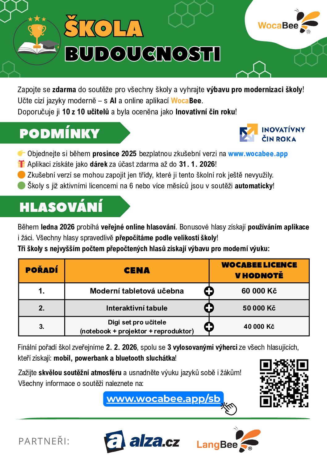 Během ledna 2026 bude probíhat veřejné online hlasování pomocí e-mailové adresy. Více info na: www.wocabee.app . Děti získávají bonusové body používáním aplikace.