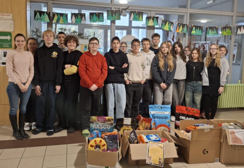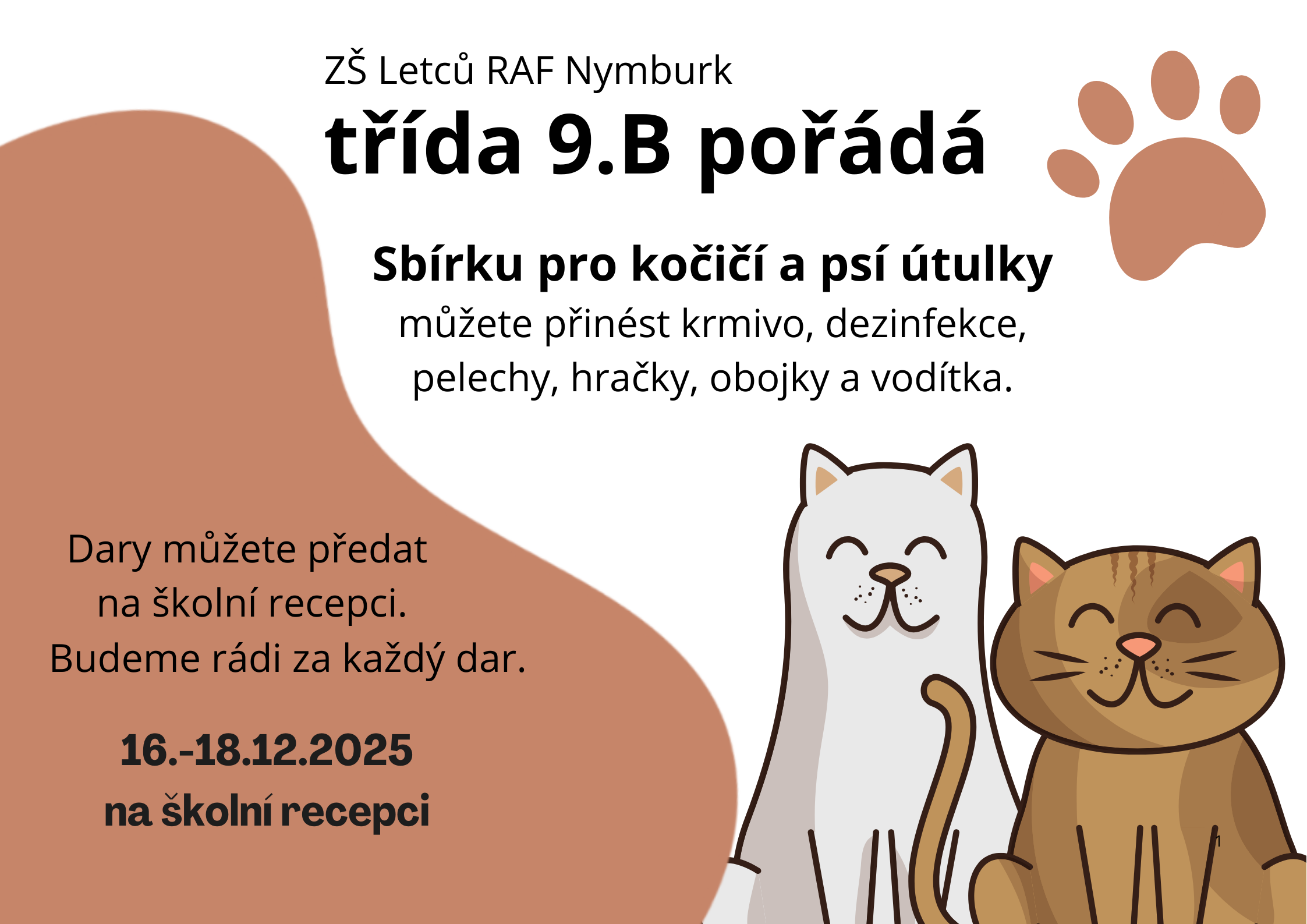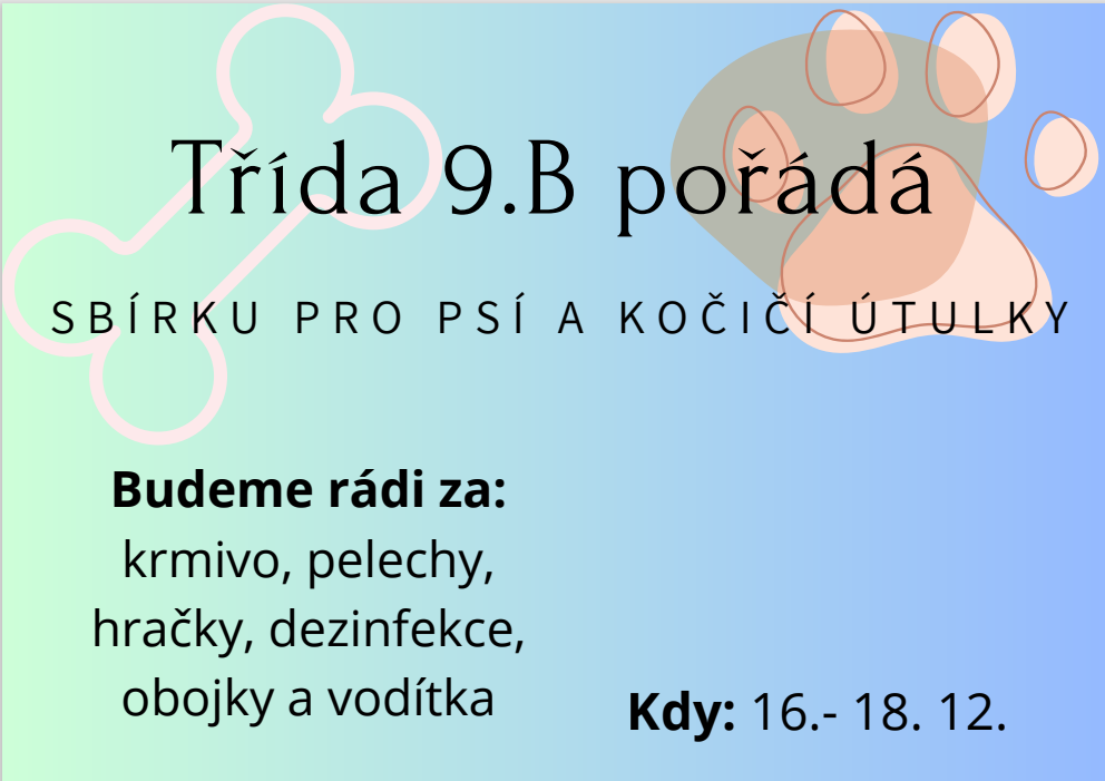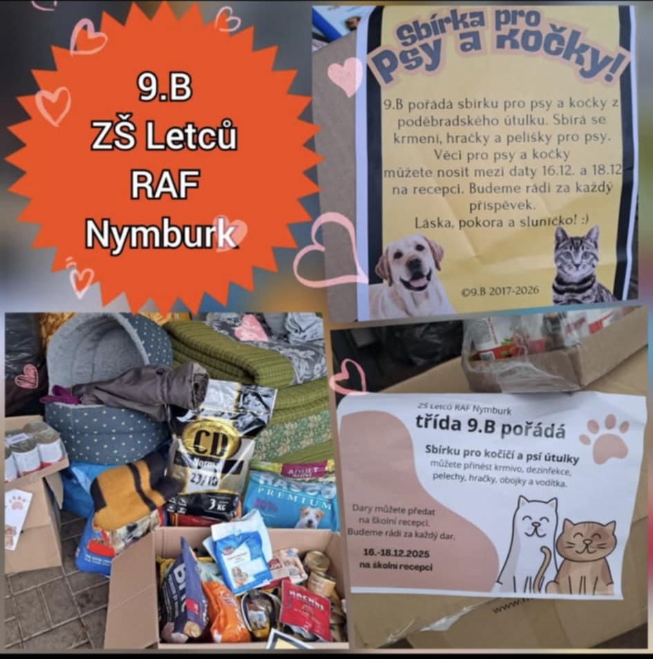 Třída 9. B i letos uspořádala sbírku pro psy a kočky z útulků a zapojila do ní celou školu. Tuto akci děláme pravidelně od roku 2022 vždy před Vánocemi. Loni jsme poprvé do akce zapojili celou školu. Letos jsme měli možnost se do poděbradských útulků i podívat. Útulek se psy se může chlubit originálními jmény a hezkou atmosférou. Útulek pro kočky působil klidně a vlastní ho velmi sympatická paní. Všichni jsme rádi, že jsme mohli útulky navštívit, a mrzí nás, že tohle je naše poslední vánoční nadílka.