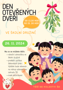 Den otevřených dveří ve školní družině 26. 11. od 13.30 hod až 15.30 hod. Těší se kolektiv ŠD